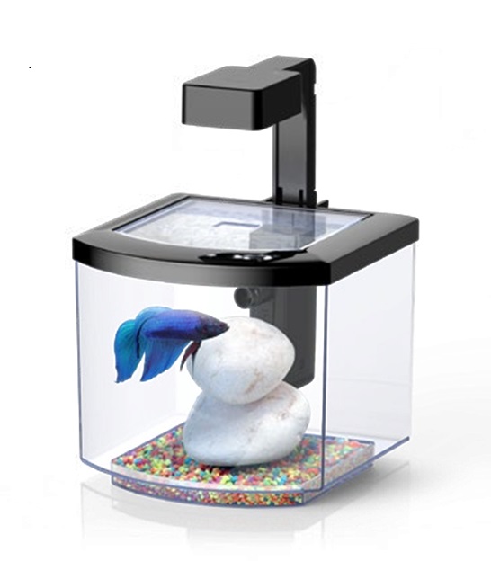 Aquário de baixo volume para um único peixe, como Betta. A capa está disponível em três cores diferentes e é removível para facilitar o acesso ao interior.