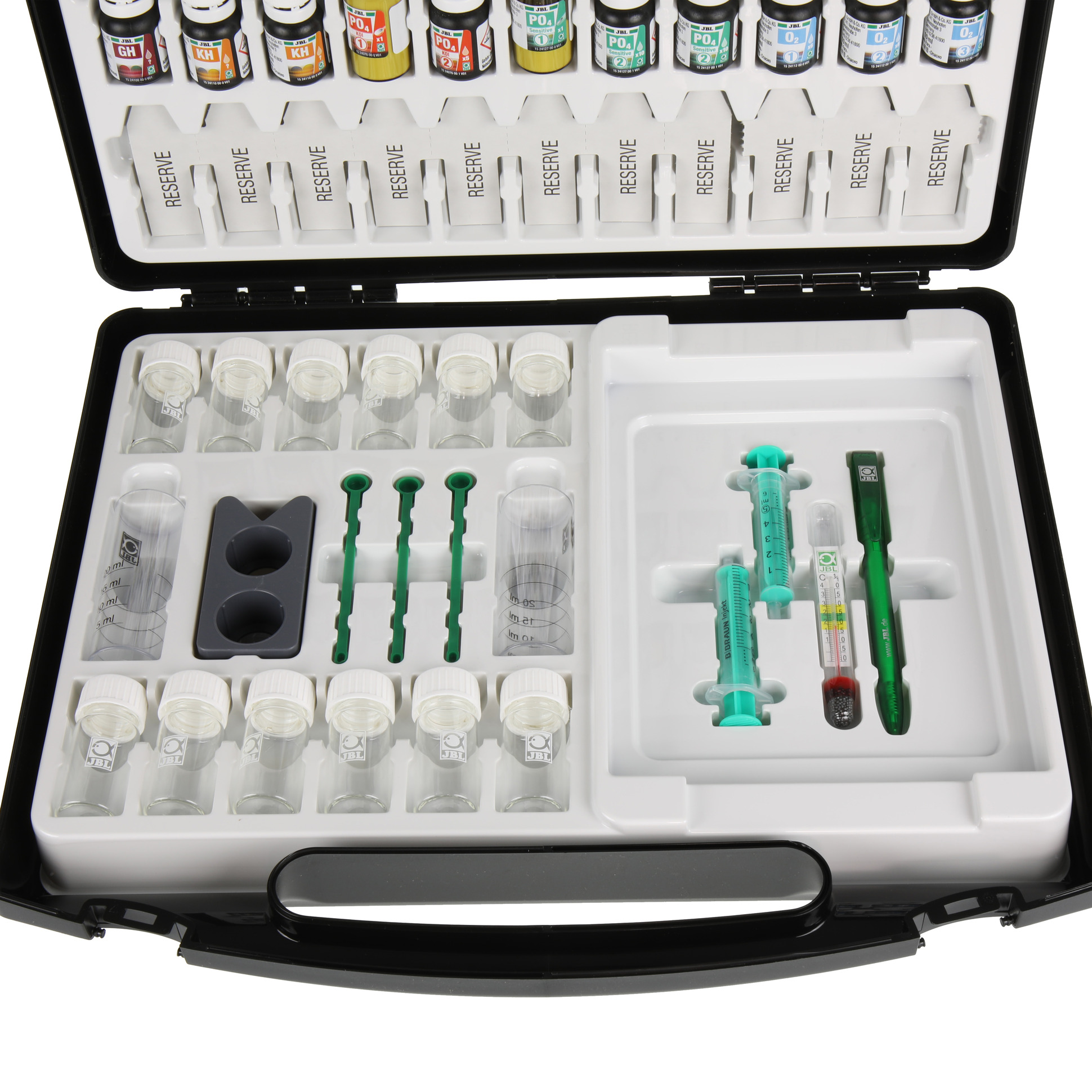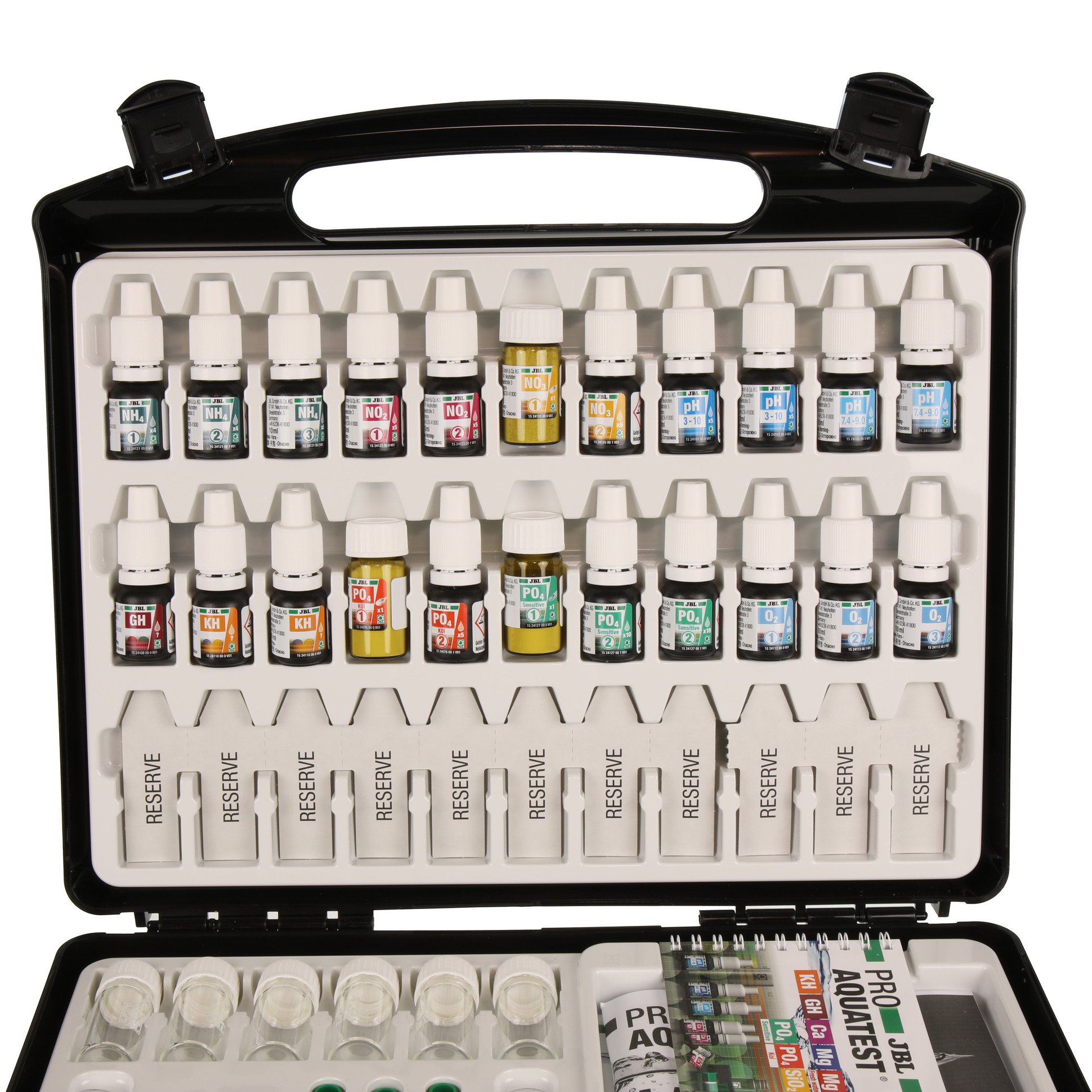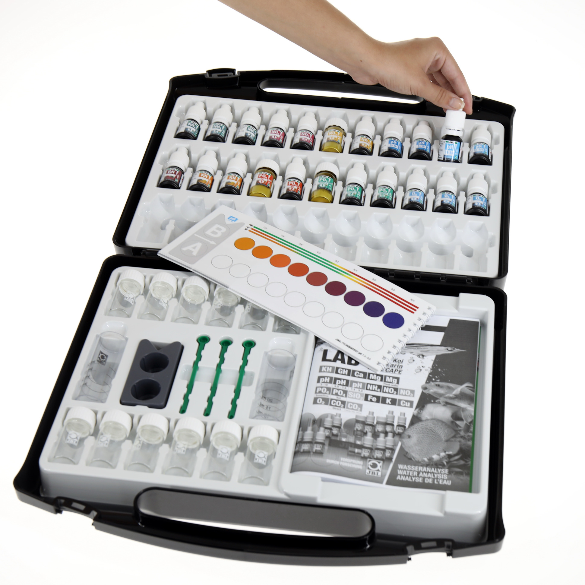 - Incluído: maleta de teste incl. 22 reagentes, cuvetes de vidro, seringas, colheres doseadoras, termómetro, bloco comparador, cuvetes de plástico, paletas de cores, esferográfica, folhas de registo e instruções