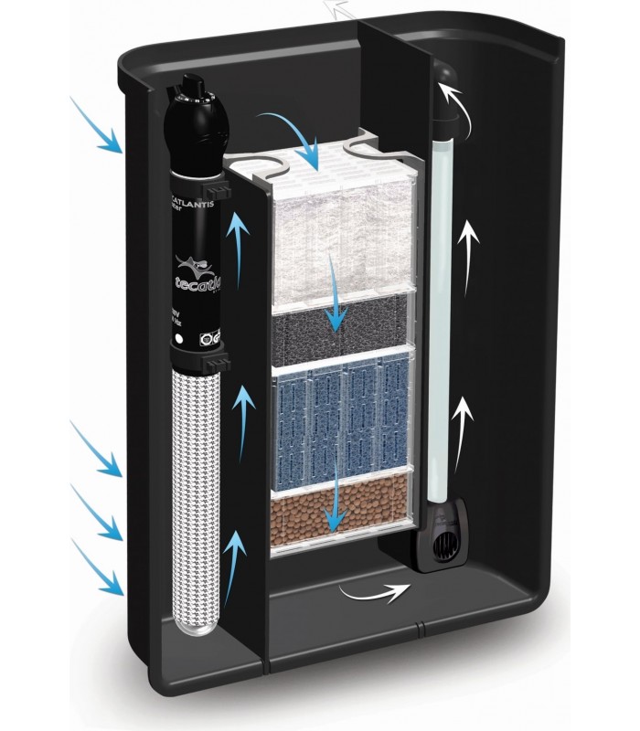 Filtro interior com uma excelente performance trabalhando contra os elementos prejudiciais nos aquários. Bomba de circulação 300l/h incluída, assim como 4 estágios de filtragem.