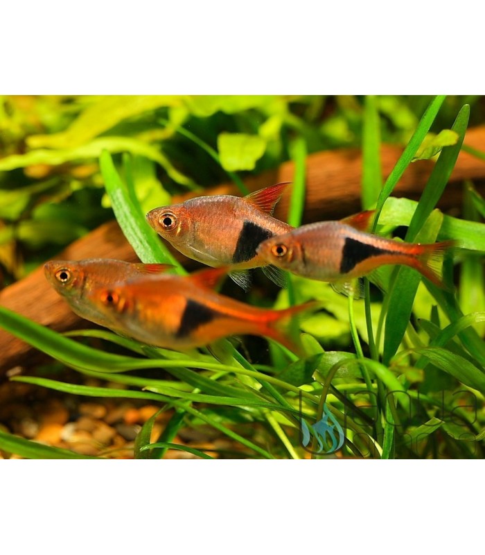 Esta espécie (Trigonostigma heteromorpha) é conhecida como Rasbora Arlequim. É um peixe de cardume fantástico e resistente. Possui uma coloração castanha avermelhada na zona anterior e um triângulo azul escuro na zona posterior. O macho tem ainda uma linha dourada na parte superior deste triângulo. As barbatanas são amareladas nas pontas e carmim na restante superfície.