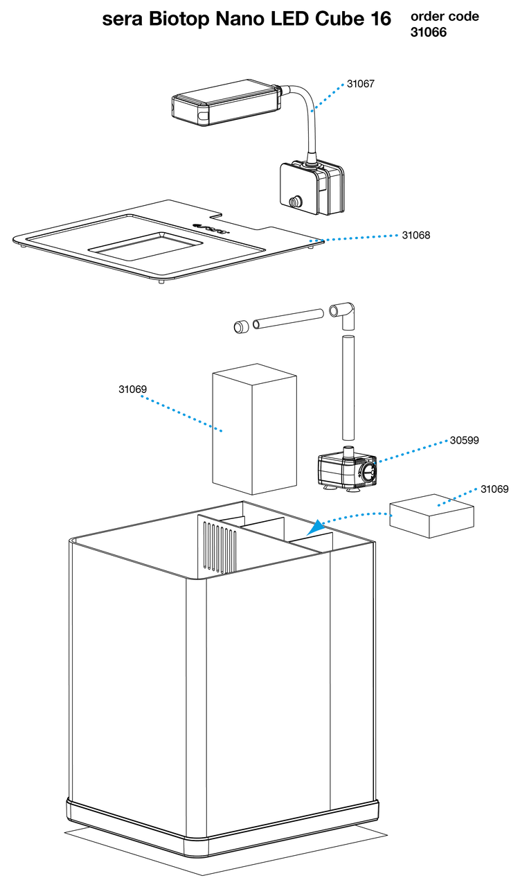 Este aquário Nano moderno, com vidro convexo e um volume total de 16 litros, junto com o seu equipamento, foi concebido para a manutenção permanente de camarões ou, por exemplo, de um par de Peixes Combatentes. Com 4 litros de volume, o filtro interior têm uma grande capacidade de filtragem. Em termos de altura, o sera Biotop Nano LED Cube 16 oferece espaço para fantásticas paisagens aquáticas. A elegante lâmpada sera Nano LED light incluída na embalagem é regulável, fácil de orientar, graças ao seu braço flexível, e de baixo consumo de energia. O equipamento incluído na embalagem permite um funcionamento imediato.